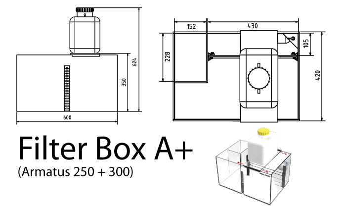 - Glazen onderbouwfilter met voorfilter kamer, twee helder water kamers voor gebruik met addititionele biologische en mechanische filter (b.v. eiwitafschuimer, multi reactor enz) en filter media.