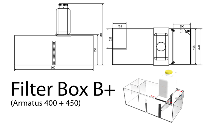 - Glazen onderbouwfilter met voorfilter kamer, twee helder water kamers voor gebruik met addititionele biologische en mechanische filter (b.v. eiwitafschuimer, multi reactor enz) en filter media.