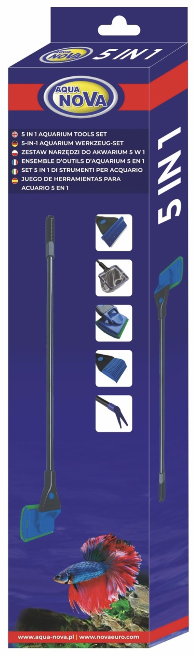 Aqua Nova 5 in 1 Aquarium Gereedschap Set De Aqua Nova 5 in 1 aquarium gereedschap set is een veelzijdige onderhoudsset voor het eenvoudig reinigen en verzorgen van het aquarium. Dankzij de verwisselb...