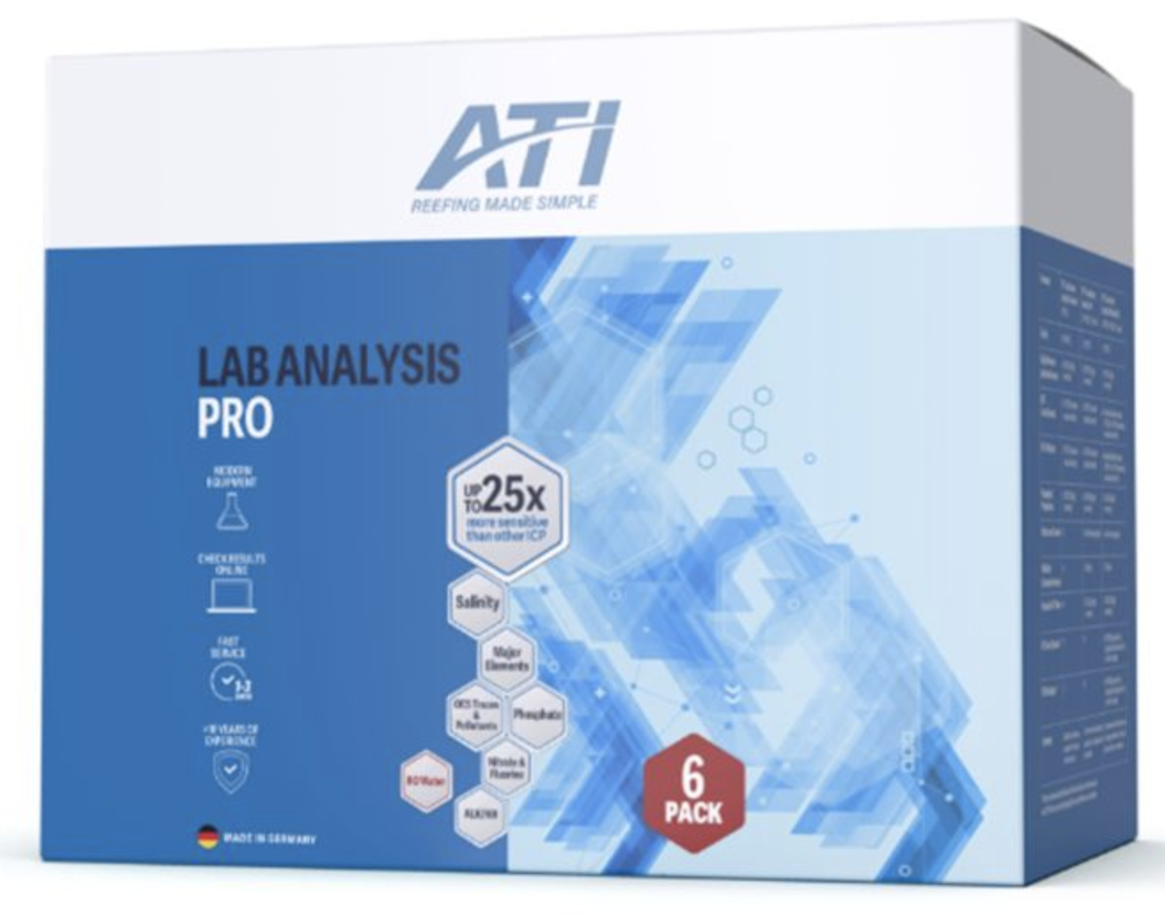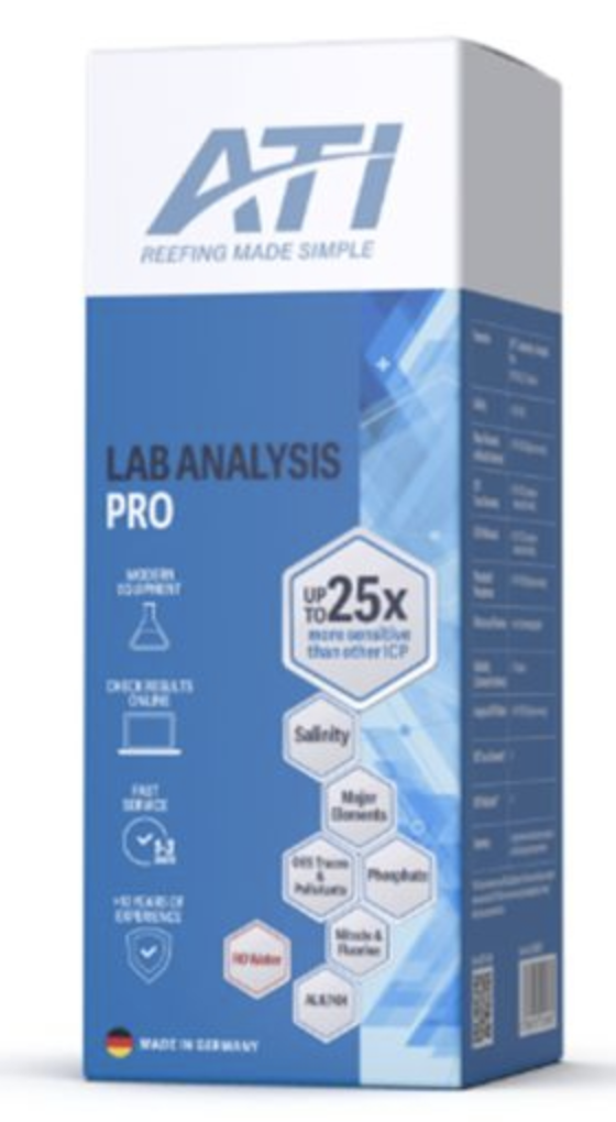 De ATI ICP Lab Analysis Pro is een uitgebreide professionele wateranalyse voor zeeaquaria. Deze analyse bepaalt alle parameters van de Standard versie en voegt daar nitraat, fluor en alkaliniteit (KH) aan toe. Daarnaast wordt ook je osmosewater geanalyseerd via ICP-OES.