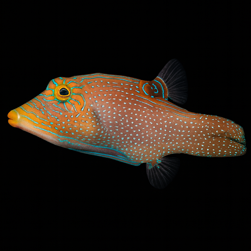 De Canthigaster solandri is een kleurrijke en opvallende kogelvis uit de Indo-Pacifische regio. Deze kleine toby-soort staat bekend om zijn levendige blauwe lijnen over een warmbruine tot oranje basis...