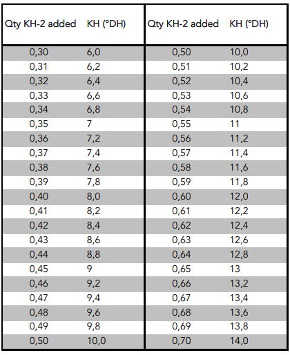 - Vermenigvuldig de gebruikte hoeveelheid KH-2 testvloeistof in milliliter met 20 om de KH-waarde in °dH te berekenen, of gebruik de tabel in de handleiding