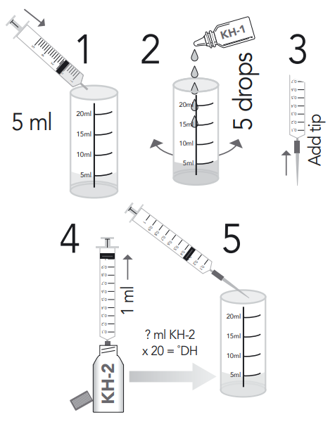 - Voeg 5 druppels KH-1 testvloeistof toe en meng. Het monster kleurt lichtblauw. Wanneer het direct geel wordt, is de KH lager dan 1 °dH