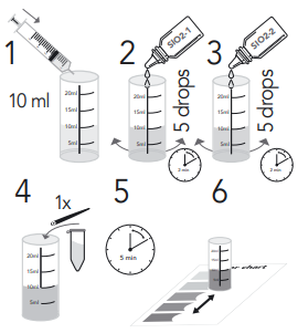 - Voeg 5 druppels SiO2-1 testvloeistof toe, schud en wacht 2 minuten