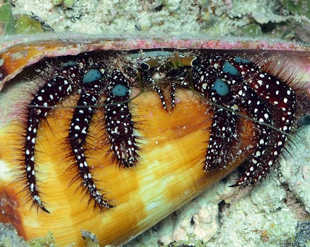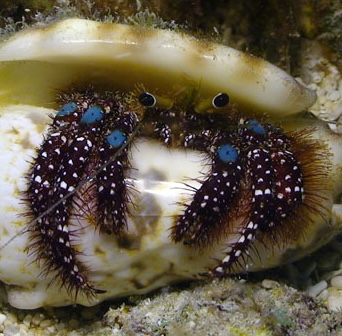 Dardanus Guttatus is een zwart gestippelde Heremietkreeft met blauwe knieen. Het zijn hele interessante dieren en goede opruimers, daarom maken ze vaak ook deel uit van de opruimploeg die als eerste het aquarium in gaat.