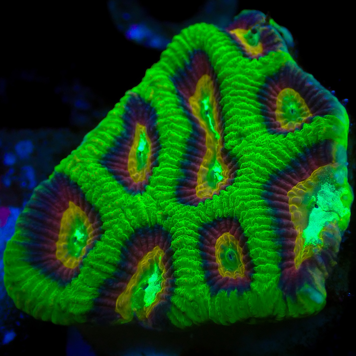 De Favites Green Blessings is een schitterende koraalsoort die direct opvalt door zijn intens groene fluorescerende kleur en compacte poliepenstructuur. Deze steenkoraal (LPS – Large Polyp Stony Coral) vormt prachtige ronde kolonies met een mozaïekachtig patroon van contrasterende tinten groen en soms subtiele blauwe accenten.