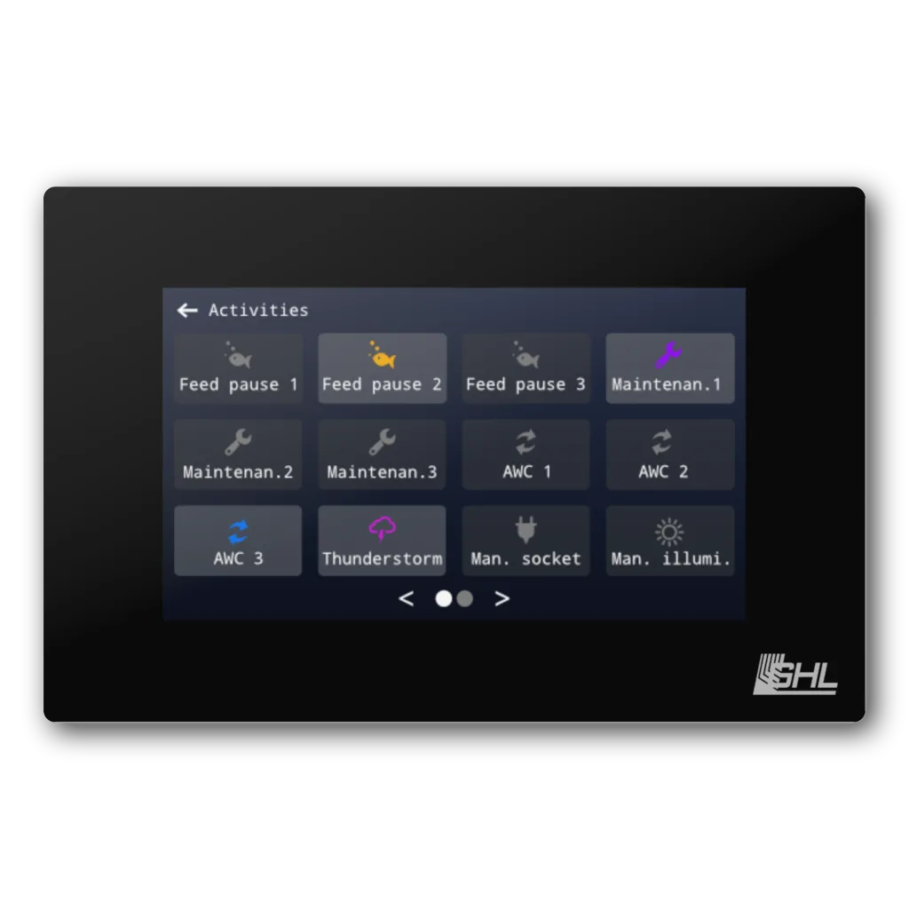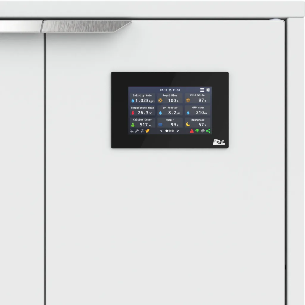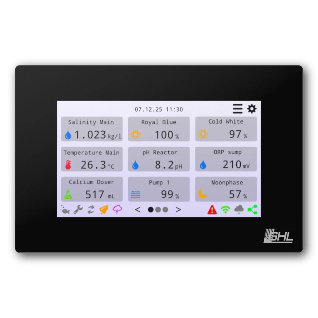 Dankzij de overzichtelijke interface met aanpasbare statusvelden, grafieken en directe bedieningsopties heb je altijd snelle toegang tot metingen, verlichting en aangesloten apparatuur. Functies zoals waterwissel, onderhoudsmodus, onweersimulatie en lichtscènes kunnen direct vanaf het scherm worden geactiveerd.