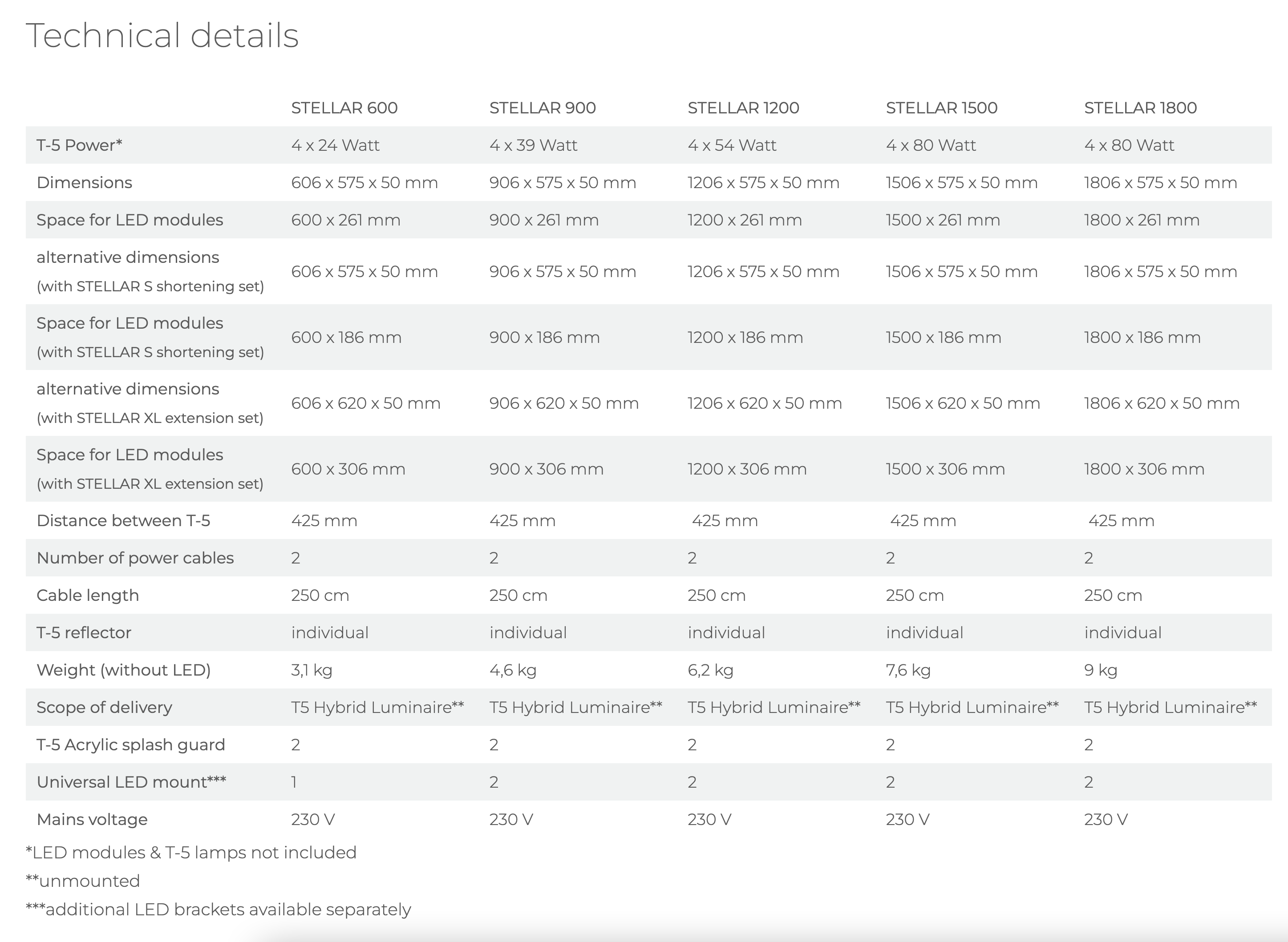 Giesemann Stellar Hybrid is gebaseerd op de Giesemann Gemini Hybrid, wat betekent dat twee groepen met in totaal 4 T5 lampen worden gevoed met VHO-voorschakelapparaten voor een hoge output en een uitstekende kleurweergave. Elke T5-lamp heeft zijn eigen reflector, gemaakt van het beste reflectormateriaal op de markt. Het armatuurlichaam is gemaakt van hoogwaardig aluminium en volledig gepoedercoat in iridium metallic of puur wit.