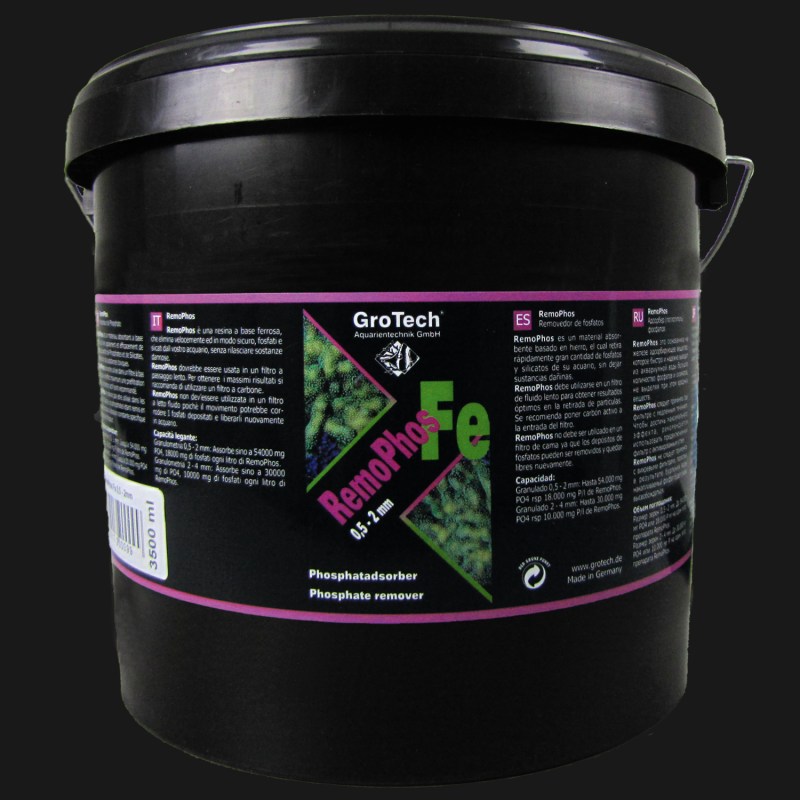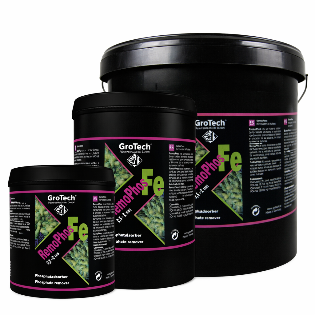 Grotech RemoPhos FE is een ijzergebaseerde fosfaatverwijderaar die snel en effectief grote hoeveelheden fosfaat en silicaat uit aquariumwater verwijdert. Het adsorptiemateriaal bindt deze ongewenste stoffen betrouwbaar zonder schadelijke stoffen af te geven aan het water.