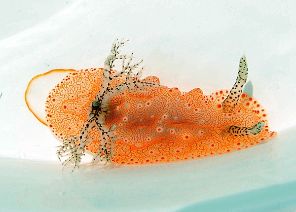 De Halgerda batangas is een opvallende en zeldzame zeenaaktslak die een ware blikvanger vormt in het zeeaquarium. Met zijn feloranje rug met witte vlekken en karakteristieke ribbels is deze slak gelie...