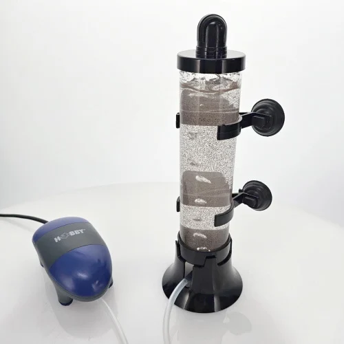 - De luchtstroom zorgt voor een zachte werveling, waardoor eitjes en nauplii continu in beweging blijven.