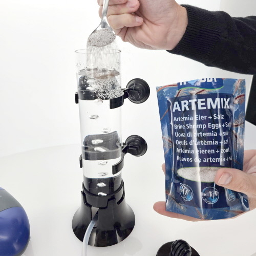 - Voeg 10 gram Artemia-zout en de gewenste hoeveelheid Artemia-eitjes toe (of gebruik kant-en-klare Artemix).