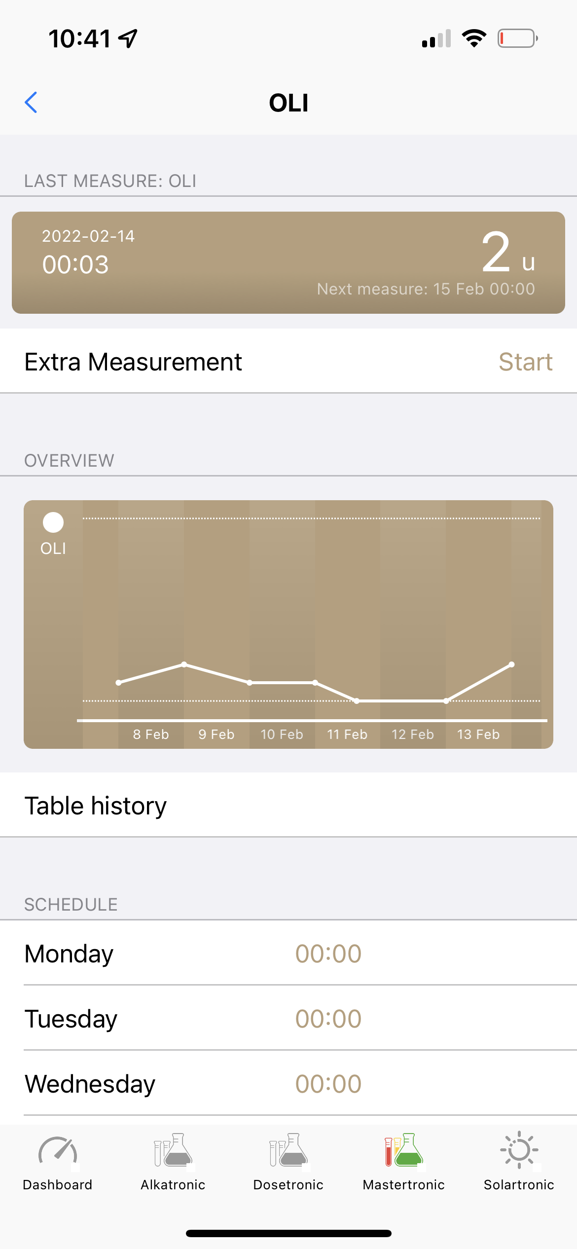 Het dashboard van de AIO-app toont de gebruiker de meest recente testgegevens van Mastertronic, Alkatronic en zelfs het lichtschema van Solartronic. Een eenvoudig en intuïtief overzicht van de huidige status van het systeem.