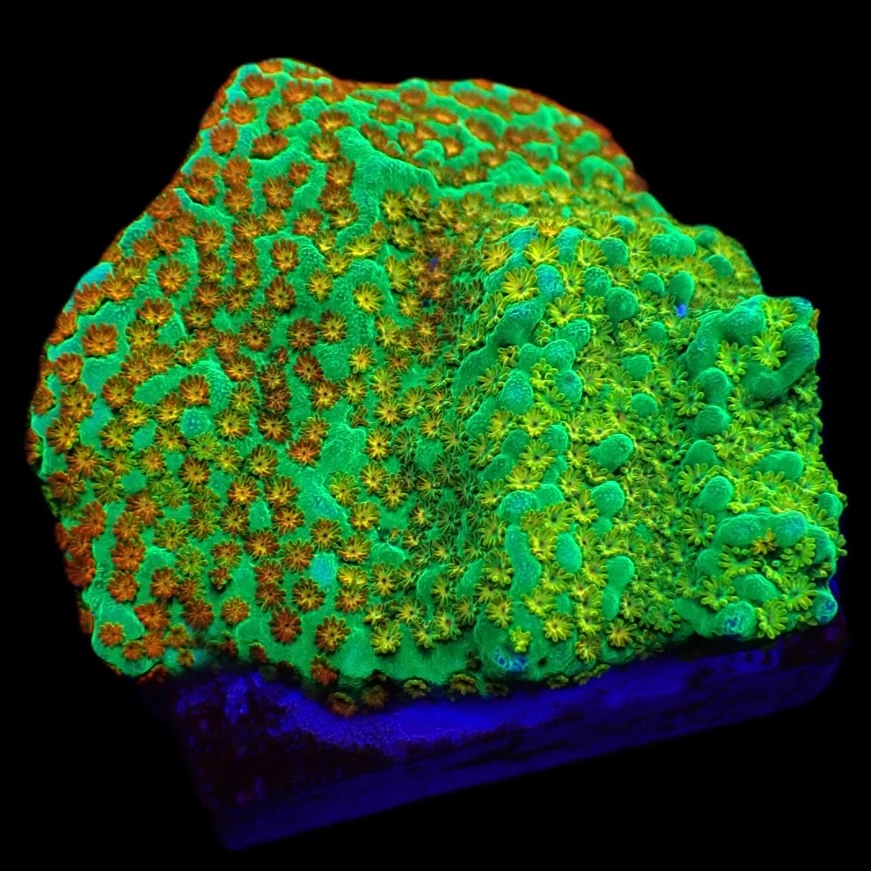 Montipora Fruity Pebbles, plaatvormig SPS koraal. (fel gekleurde, dikke poliep, rainbow kleuren, neon groene body).