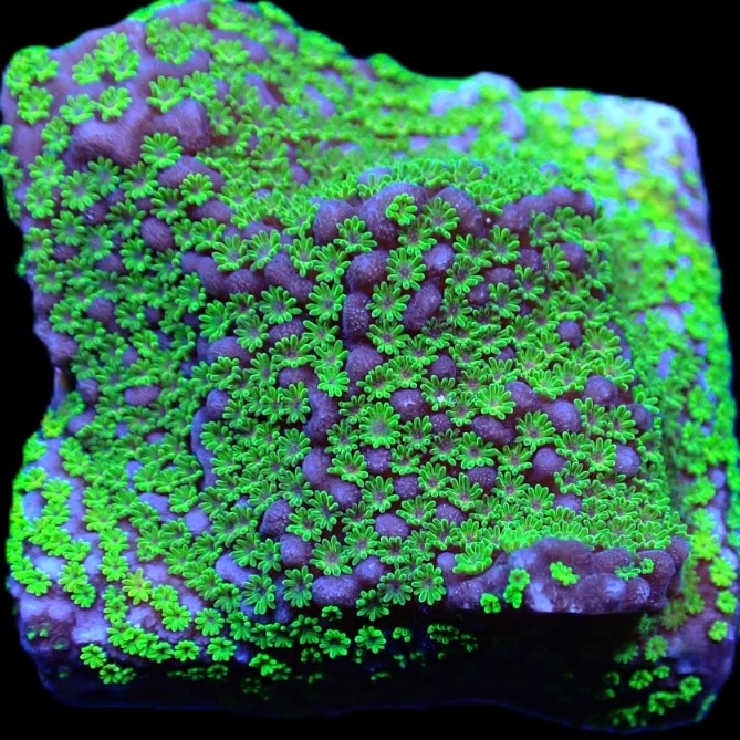 - Kleur: Diep paars met opvallende, heldere groene poliepen