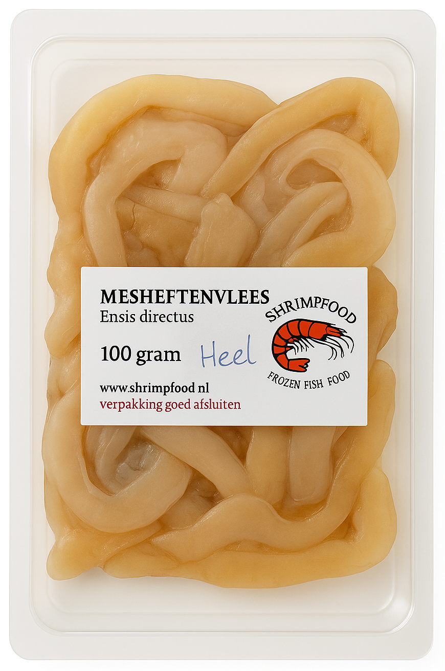 Mesheftenvlees – Shrimpfood | 100 gram / Razor Clam Meat (Ensis directus) Het Mesheftenvlees van Shrimpfood is van hoge kwaliteit en speciaal geselecteerd voor het voeren van tropische en zoutw...