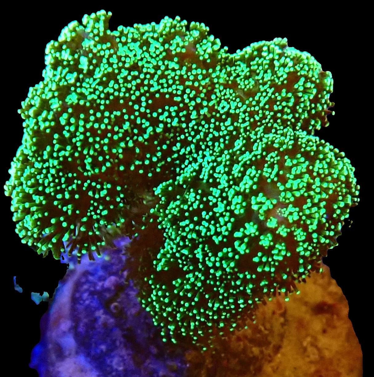 Stylophora Ultra Green, takvormig SPS koraal met fel groene poliepen. Kenmerken Heeft veel licht nodig Beste te houden onder T5 verlichting of high end LED verlichting Kan niet tegen schom...