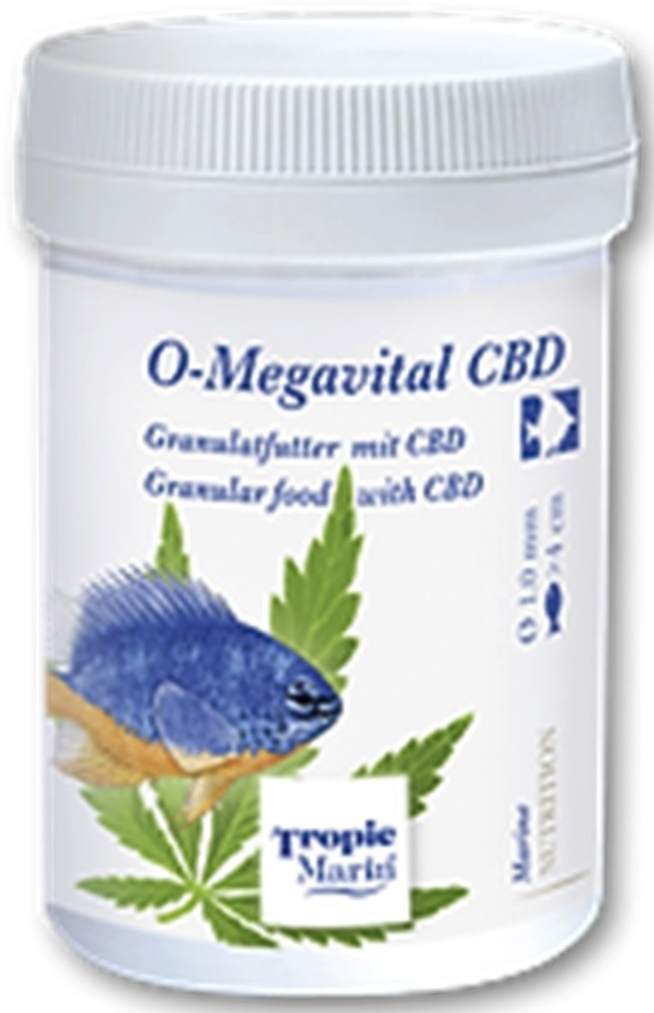 Tropic Marin® O-Megavital CBD is een korrelvoer gemaakt van hoogwaardige Scandinavische wilde vis en waardevolle zeealgen. Dankzij de bijzonder milde productiemethoden blijven de vitaminen, meervoudig onverzadigde vetzuren en de natuurlijke smaak van het voer intact. Het zeewieraandeel van Tropic Marin® O-Megavital CBD dekt de behoefte van de vissen aan jodium en sporenelementen en bevordert de natuurlijke darmflora. De vissen blijven energiek en tonen al hun schoonheid en kleurenpracht. Het gebruik van geselecteerde visoliën dekt de energiebehoefte van de vissen en optimaliseert de stofwisseling zonder schadelijke afbraakproducten zoals ammonium te produceren. Het granulaat blijft lang stabiel en zinkt langzaam, waardoor de vissen op verschillende dieptes ook voldoende worden voorzien.
