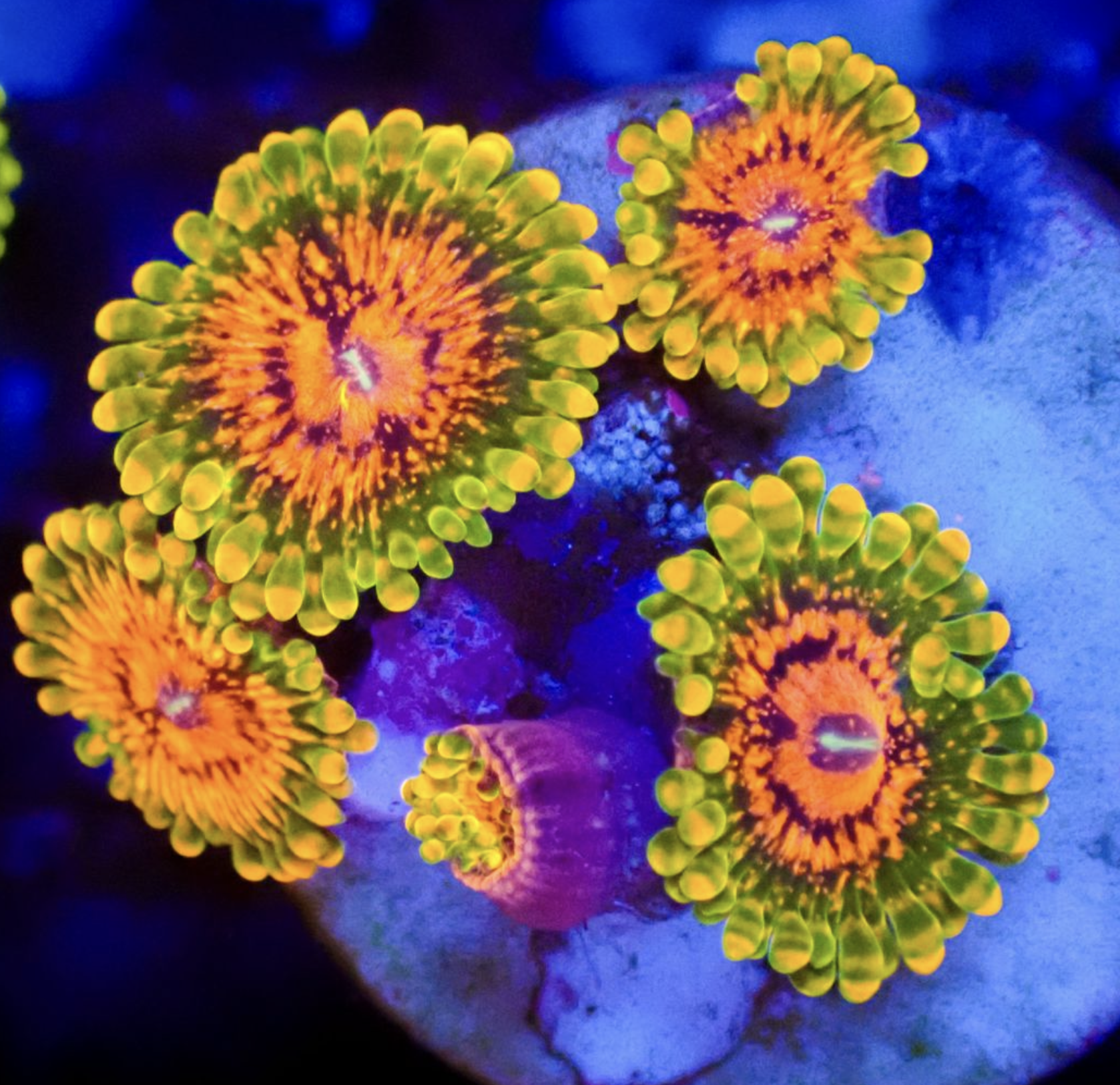 Zoanthus Grand master Krakatoa zijn bizar kleurrijke poliepen, meest felle, zelfzame zoanthus ter wereld.