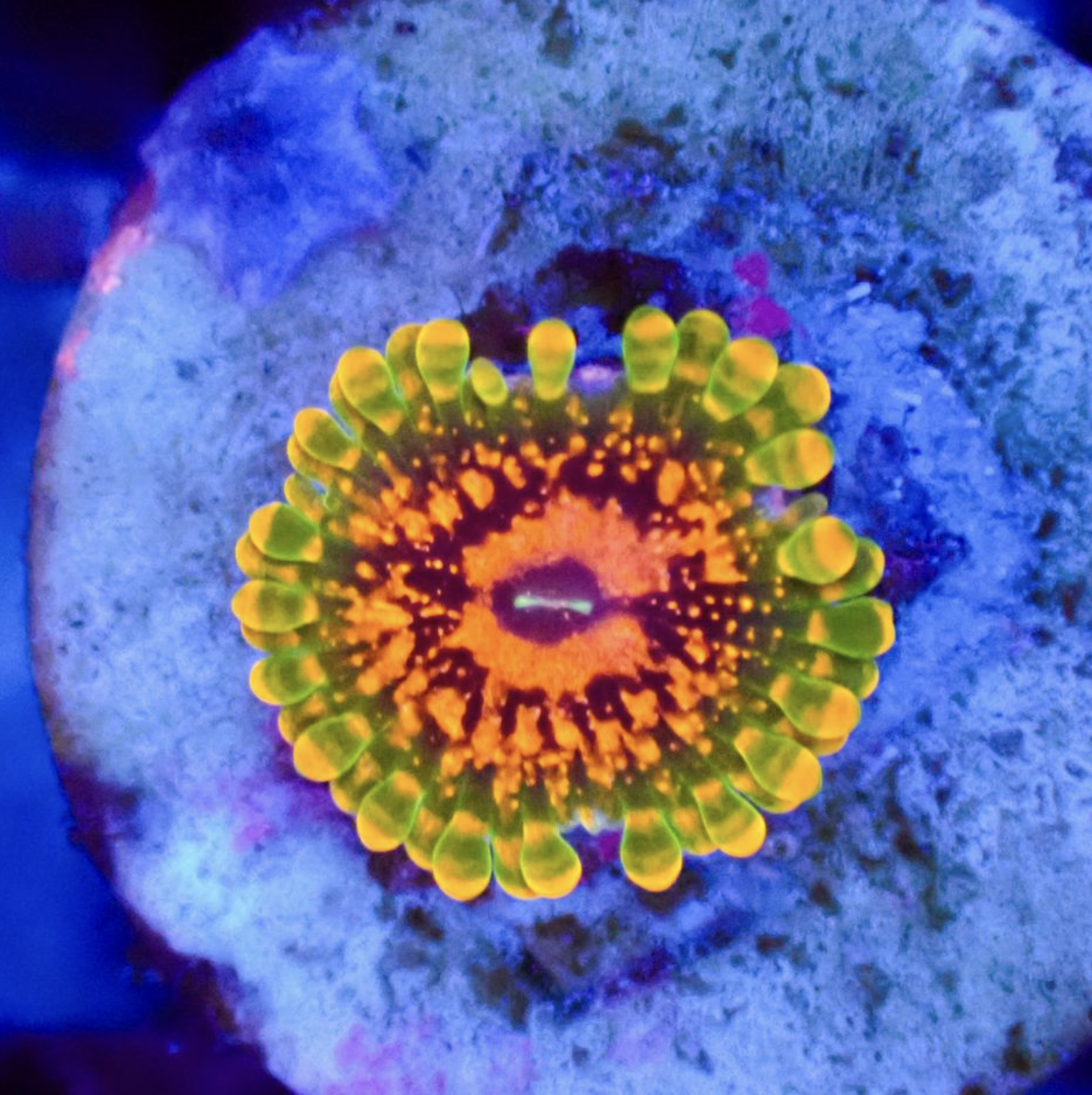 106099939 Zoanthus Nirvana zijn bizar kleurrijke poliepen, fel, fluoriserend geel / groen / oranje van kleur. Echte multi colour zoanthus.