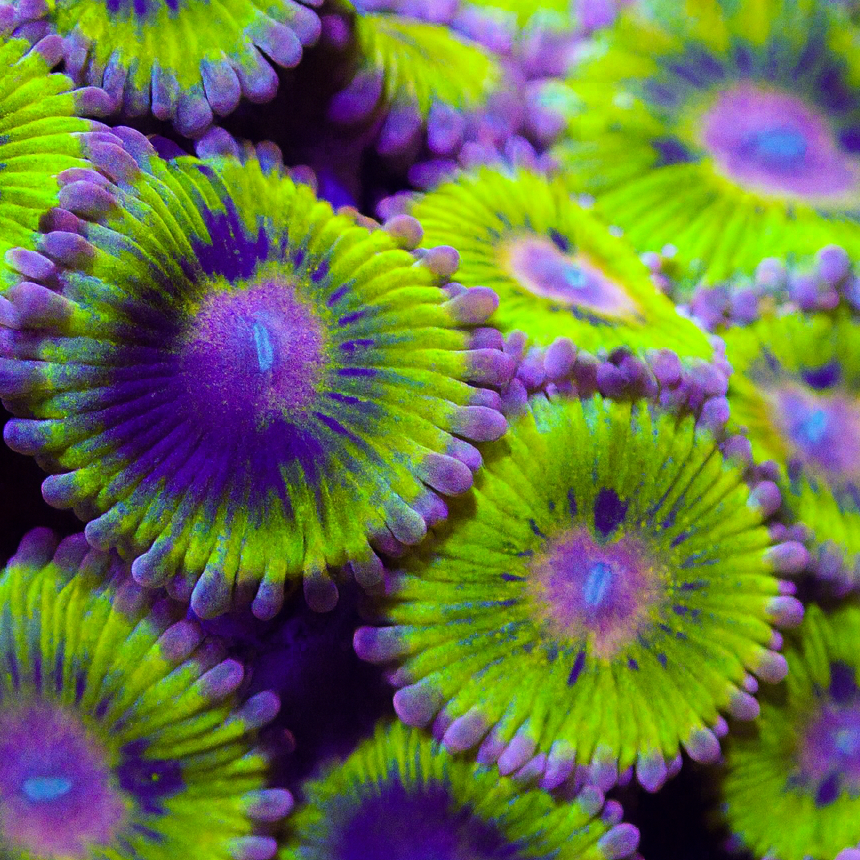 106099939 Zoanthus Nirvana zijn bizar kleurrijke poliepen, fel, fluoriserend geel / groen / oranje van kleur. Echte multi colour zoanthus.